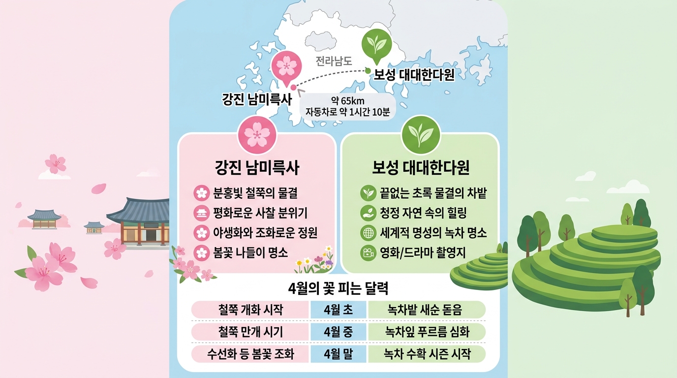 2026년 4월 중순, 분홍빛 꽃터널을 담고 싶다면 강진 남미륵사를, 싱그러운 초록 차밭을 원한다면 보성 대한다원을 선택하세요. 두 곳 모두 방문할 계획이라면 오전 8시 남미륵사 도착을 목표로 잡는 것이 주차와 인파를 피하는 최고의 전략입니다. 지금 바로 카메라 배터리를 충전하세요!