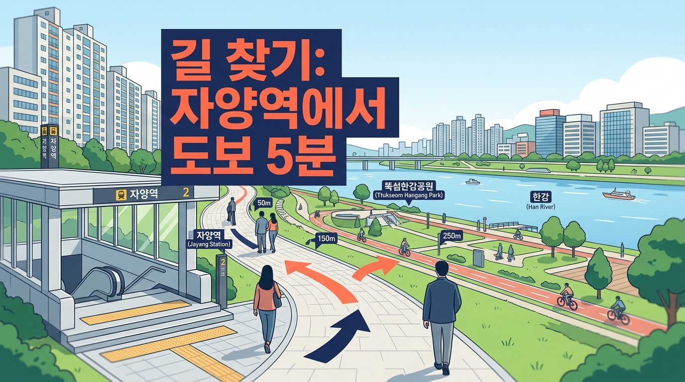 📌 요약: 7호선 자양역 2번 출구 바로 앞이에요. 서울에서 지하철 접근성이 가장 좋은 한강공원 중 하나예요.