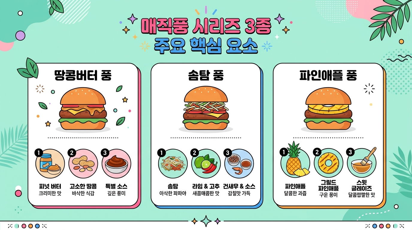 매직풍 시리즈는 크게 세 가지 라인업으로 구성되어 있는데요. 가장 대중적인 매직풍 싸이버거는 6,900원대의 합리적인 가격으로 책정되었거든요. 비프 패티를 선호하는 분들을 위한 매직풍 비프버거는 7,400원으로 조금 더 묵직한 풍미를 자랑하더라고요. 치킨 순살과 파인애플 소스의 조화를 꾀한 매직풍 빅싸이순살은 8,900원으로 책정되어 여럿이 즐기기에 적합한 구성을 보여주네요.