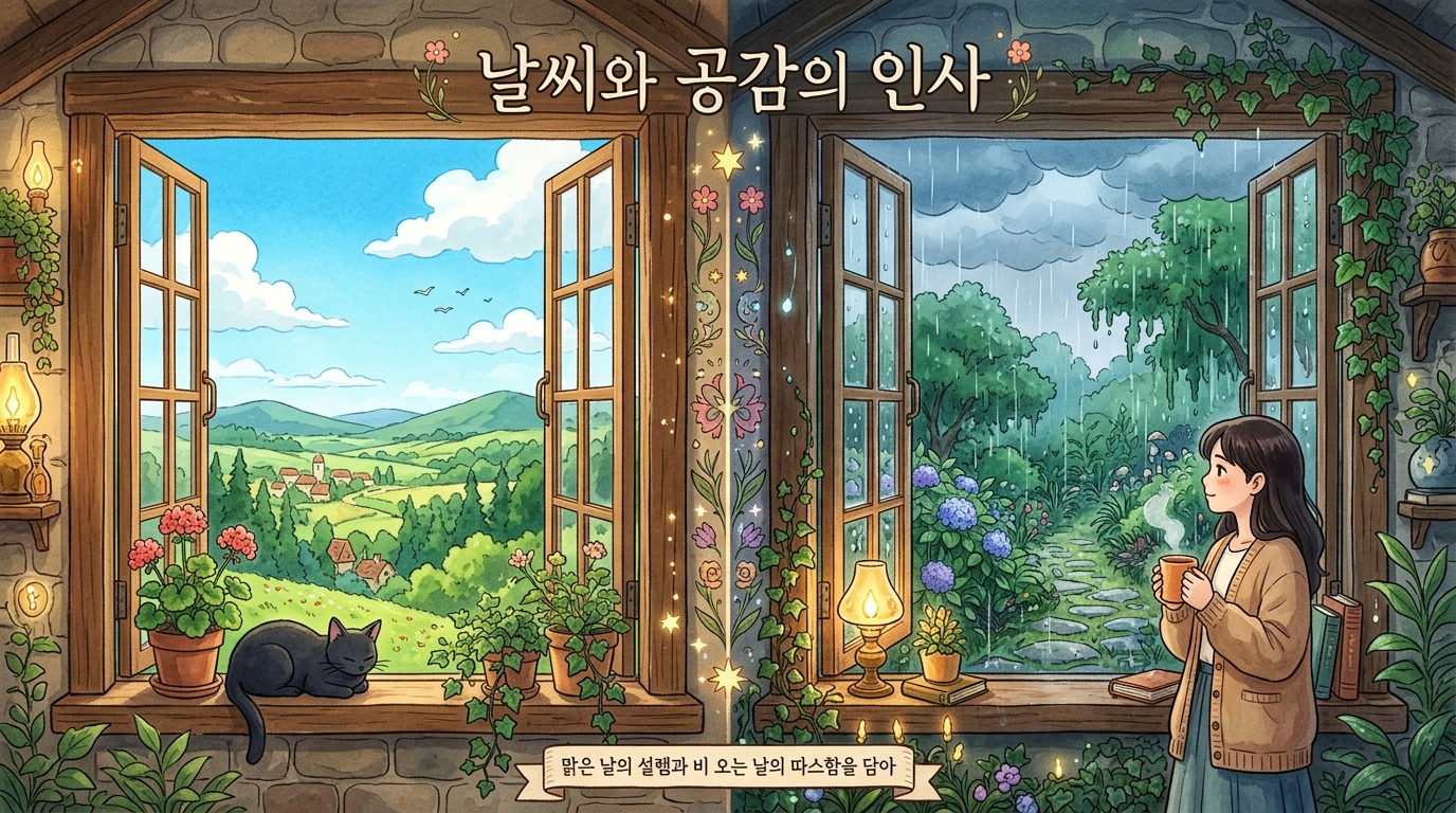 날씨 정보는 대화를 시작하는 가장 자연스러운 아이스브레이킹 소재입니다. 창밖의 풍경을 묘사하며 안부를 물어보세요.